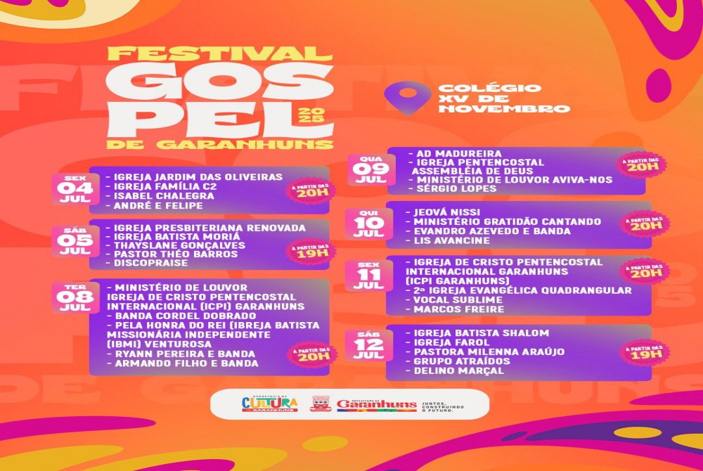 A partir desta sexta-feira (04), a quadra do Colégio XV de Novembro será palco de momentos de louvor, adoração e celebração com o início do Festival Gospel 2025. O evento, que segue até o dia 12 de julho, abre sua programação às 20h com apresentações da Igreja Jardim das Oliveiras, Igreja Família C2, Isabel Chalegra e da dupla André e Felipe.